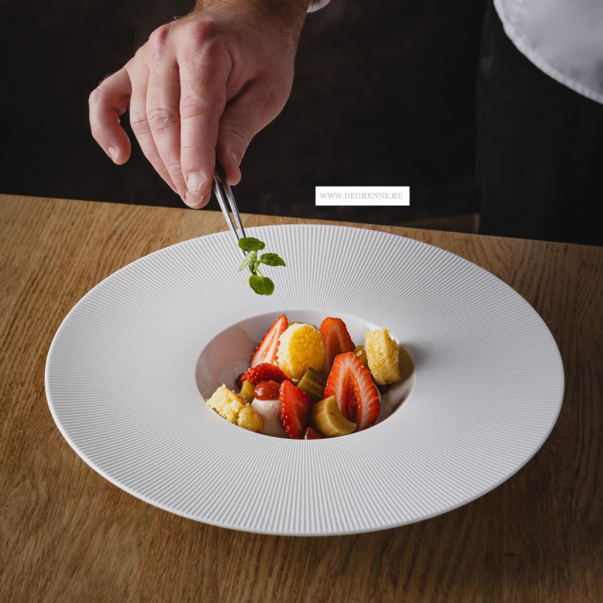 Элегантная сервировочная тарелка 32 см L RAYON из лиможского фарфора украшена рельефным узором в виде лучей. Тонкий контраст матовости и блеска придает изысканность любому кулинарному шедевру.